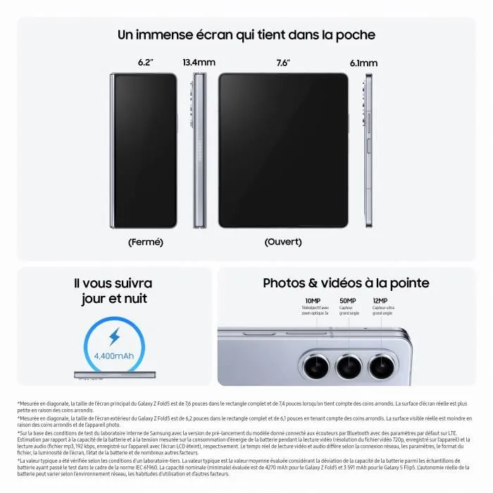 | Livré avec | Galaxy Z Fold5 – Câble USB-C vers USB-C – Outil d’éjection de la carte SIM – Guide de démarrage rapide |