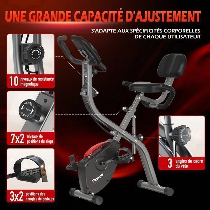 | Description du produit | Le PASYOU PX10 est un vélo d’appartement 3-en-1 (assise/allongée/pliée) avec frein magnétique 10 niveaux, siège réglable (7 vertical, 2 horizontal), sangles pédales 6 niveaux, structure acier supportant 120 kg, système bande 4 points/7 disques pour haut du corps et moniteur fréquence cardiaque intégré. |